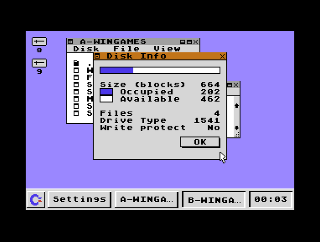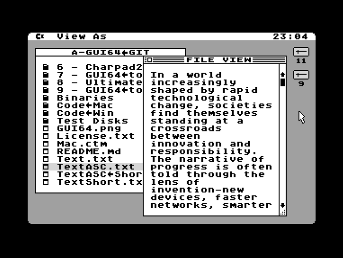 GUI64 is a graphical user interface (GUI) for the Commodore 64. Use your C64 as if it was a modern PC. It comes in two designs: one is Windows-like, the other Mac-like. With GUI64 you can do the following: